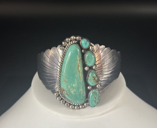 VINTAGE ZUNI STERLING SILVER & TURQUOISE "FISH SCALE" INLAY RING size 6 View item