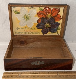 ANTIQUE JESSIE R PRIOR SEEDSWOMAN FLOWER SEED WOOD BOX CLEMATIS GARDEN FARM YARD View item