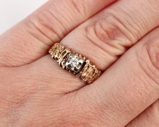 Vintage MCM 14K Rose Gold Illusion Set .12ctw Diamond Solitaire Brutalist Ring View item