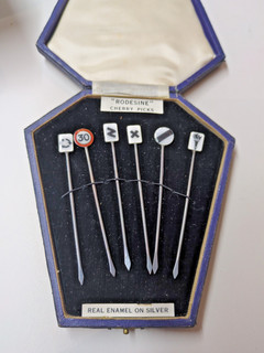 RARE ANTIQUE DECO RODESINE CHERRY PICKS COCKTAIL STICK ENAMEL SILVER ROAD SIGN View item
