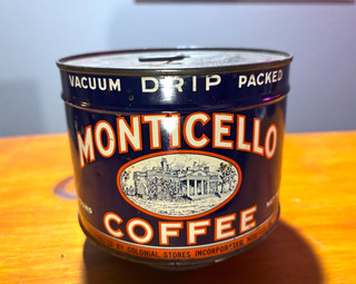 Rare 1940"s Vintage Monticello Graphic Coffee Tin. Unopened View item