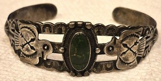 VINTAGE NAVAJO GREASY GREEN TURQUOISE THUNDERBIRD STERLING SILVER BRACELET vafo View item