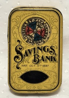 Antique 1897 Rectangle Tin Metal MECHANICAL BANK Box Spinning Dial SAVINGS BANK View item