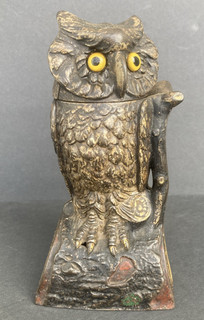 ANTIQUE 1880 CAST IRON MECHANICAL OWL COIN BANK w TURNING HEAD & GLASS EYES View item