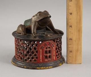 19thC Antique J&E STEVENS Painted Cast Iron Mechanical Frog Bank NO RESERVE View item