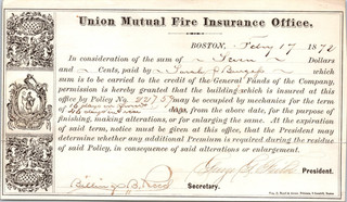 RARE 1872 UNION MUTUAL FIRE INSURANCE OFFICE PREMIUM PAYMENT BOSTON/VERMONT View item