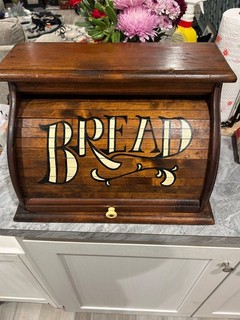 Vintage Wood Bread Box with Roll Top Lid and 'BREAD' Lettering View item