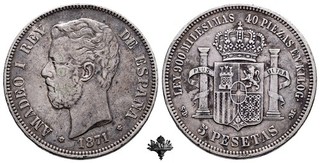 SPANIEN 5 pesetas peseten 1871 SILVER Silbermünze Amadeo I Spain View item