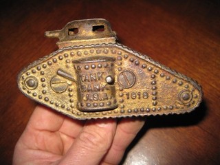 Vintage Antique Figural Cast Iron 1918 Tank Bank WWI Patriotic Still View item