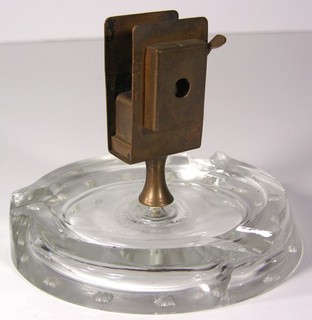 1913 BRASS COUNTERTOP CIGAR CUTTER & MATCH HOLDER ON GLASS ASHTRAY By ASHTRUCK View item