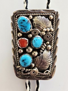 Old Pawn VINTAGE Handmade Sterling Traditional Turquoise & Coral BOLO TIE by JJ View item