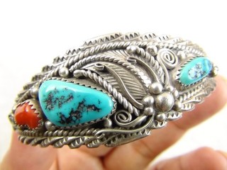 24g 6.75" Native Signed M Sterling Turquoise Coral Squash Cuff Bracelet Native View item